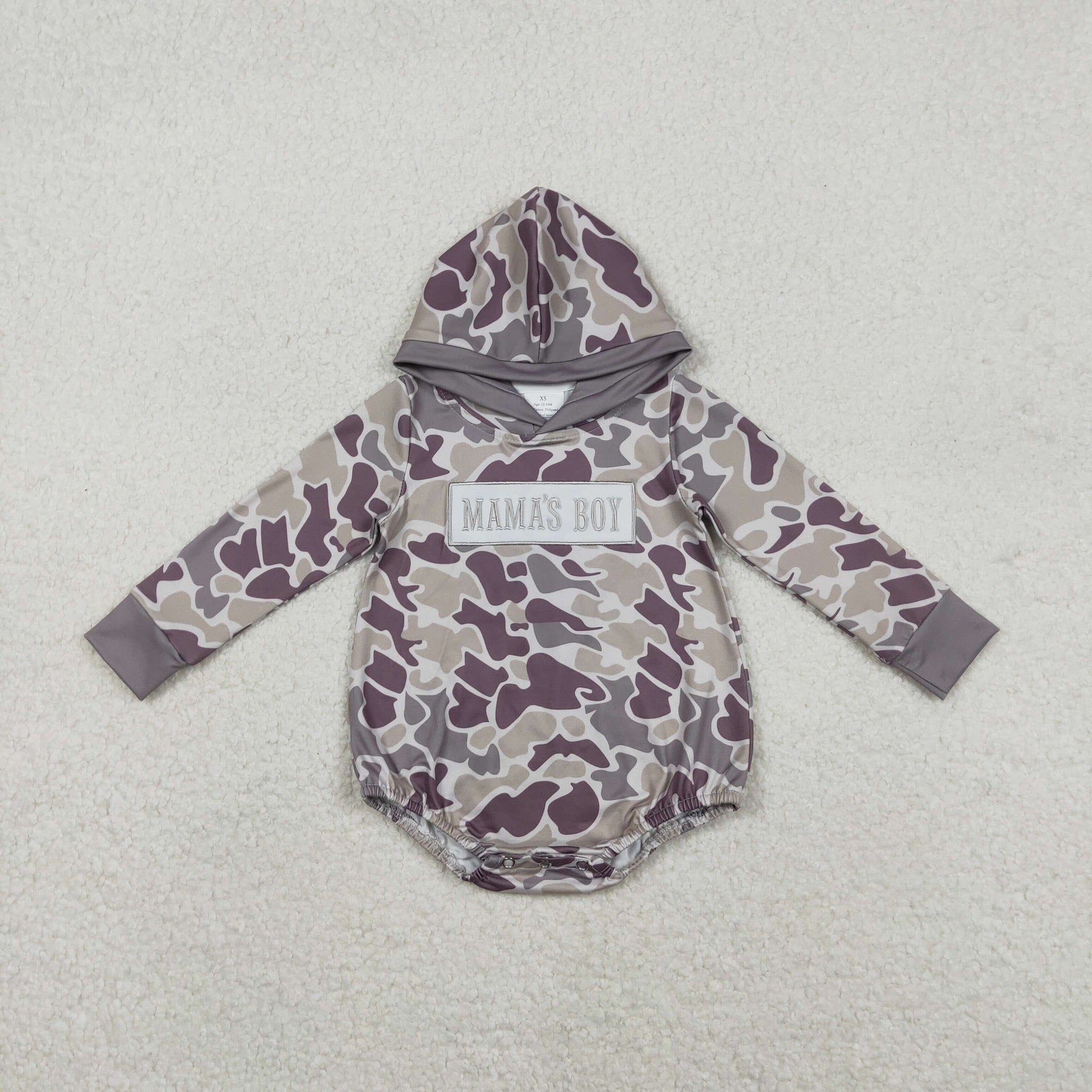 LR2792 baby boys MAMA's BOY camo long sleeves hooded romper embroidery