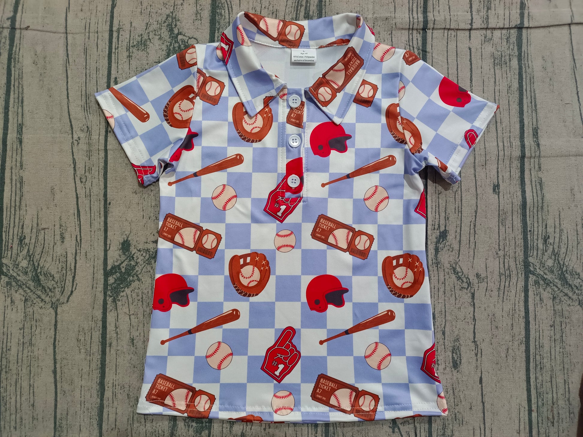 Pre-order BT1577 baby boys baseball blue checkered short sleeve button shirt top