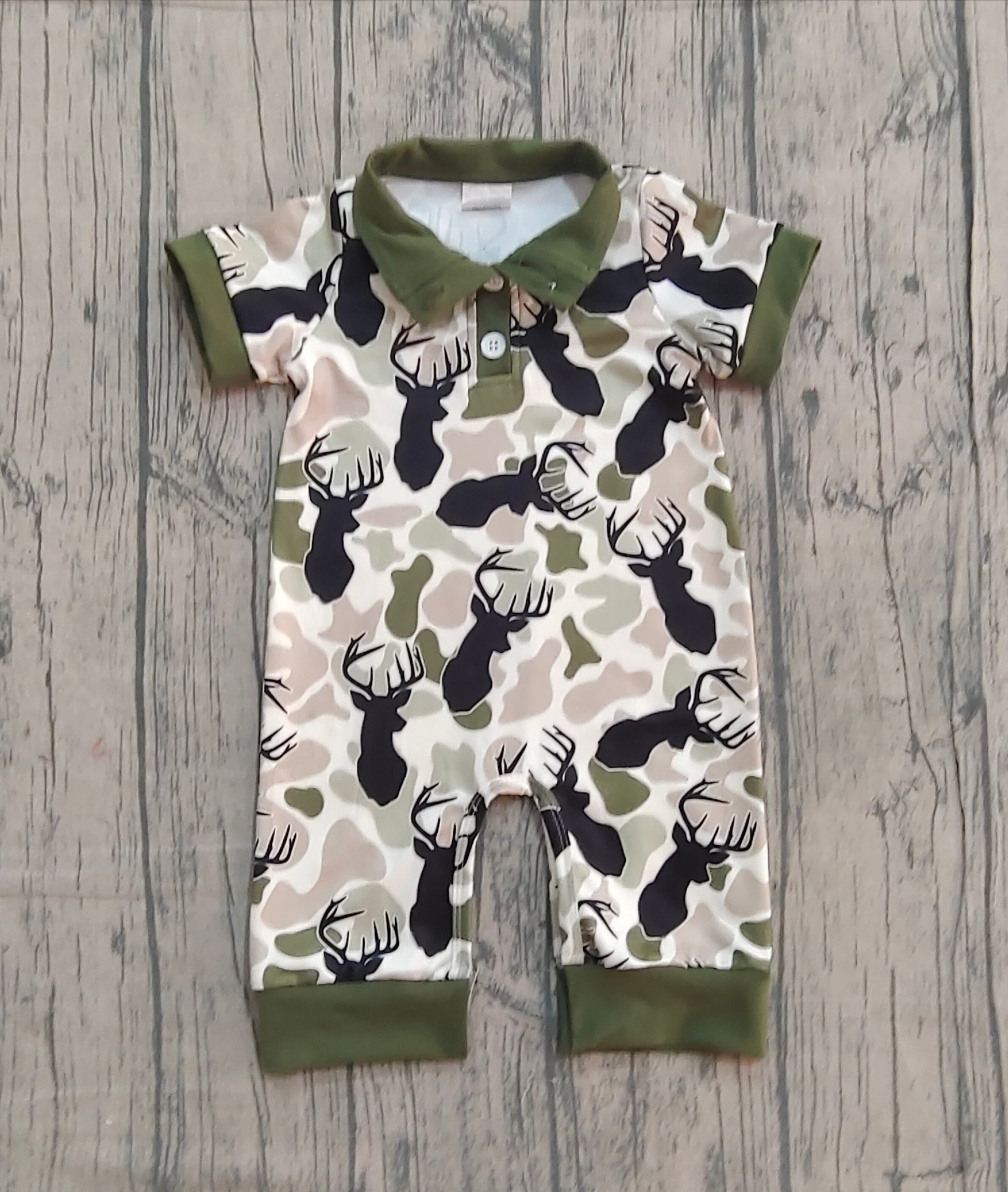 Pre-order SR3636 baby boys camo deer button green short sleeve romper