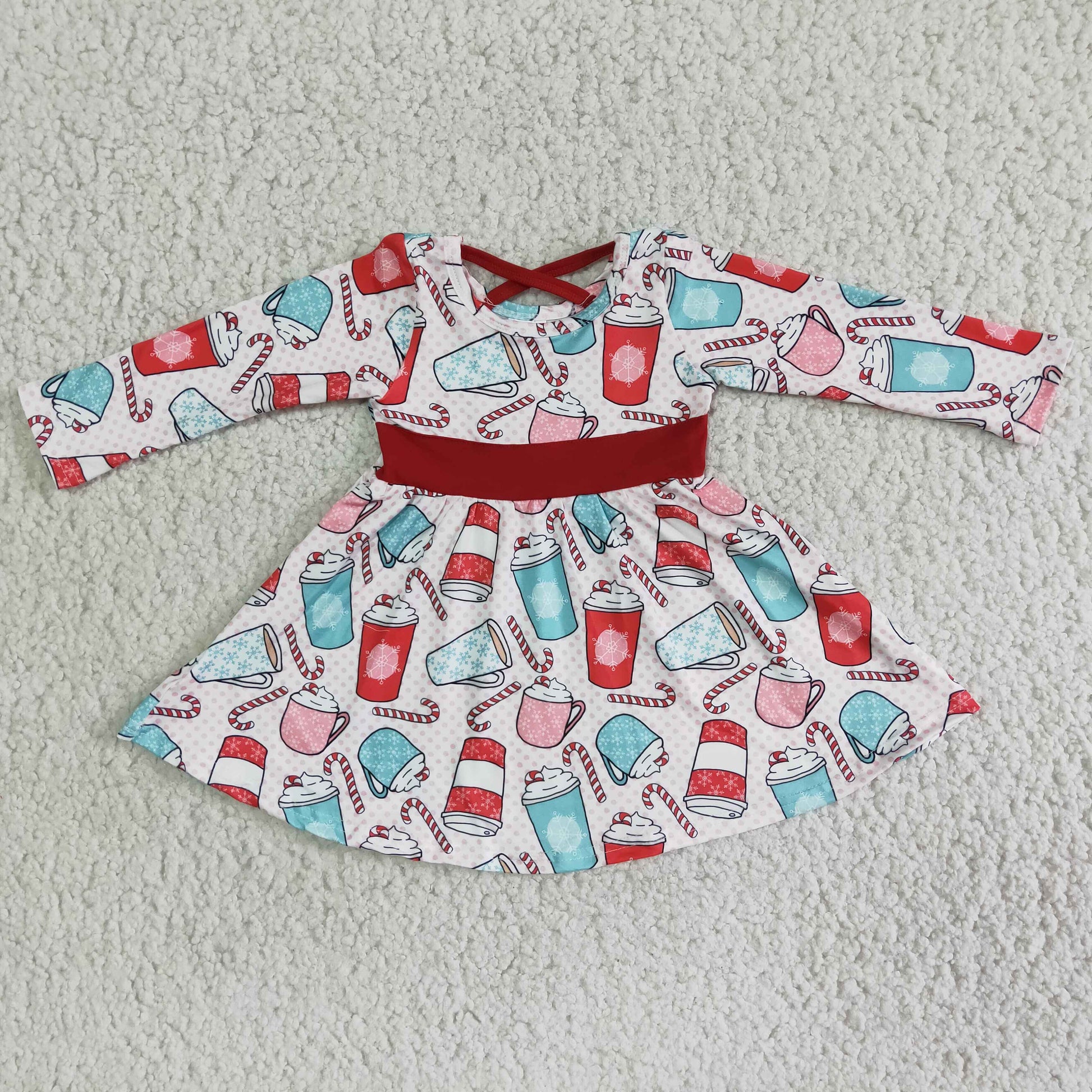 2.99 6 B12-19 Girls Coffee Candy Canes Dress Long Sleeves Red