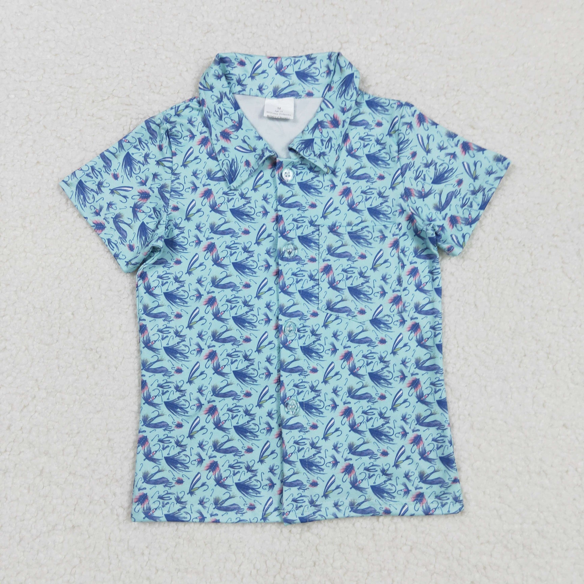 BT1296 baby boys button short sleeve Fishhook blue shirt top