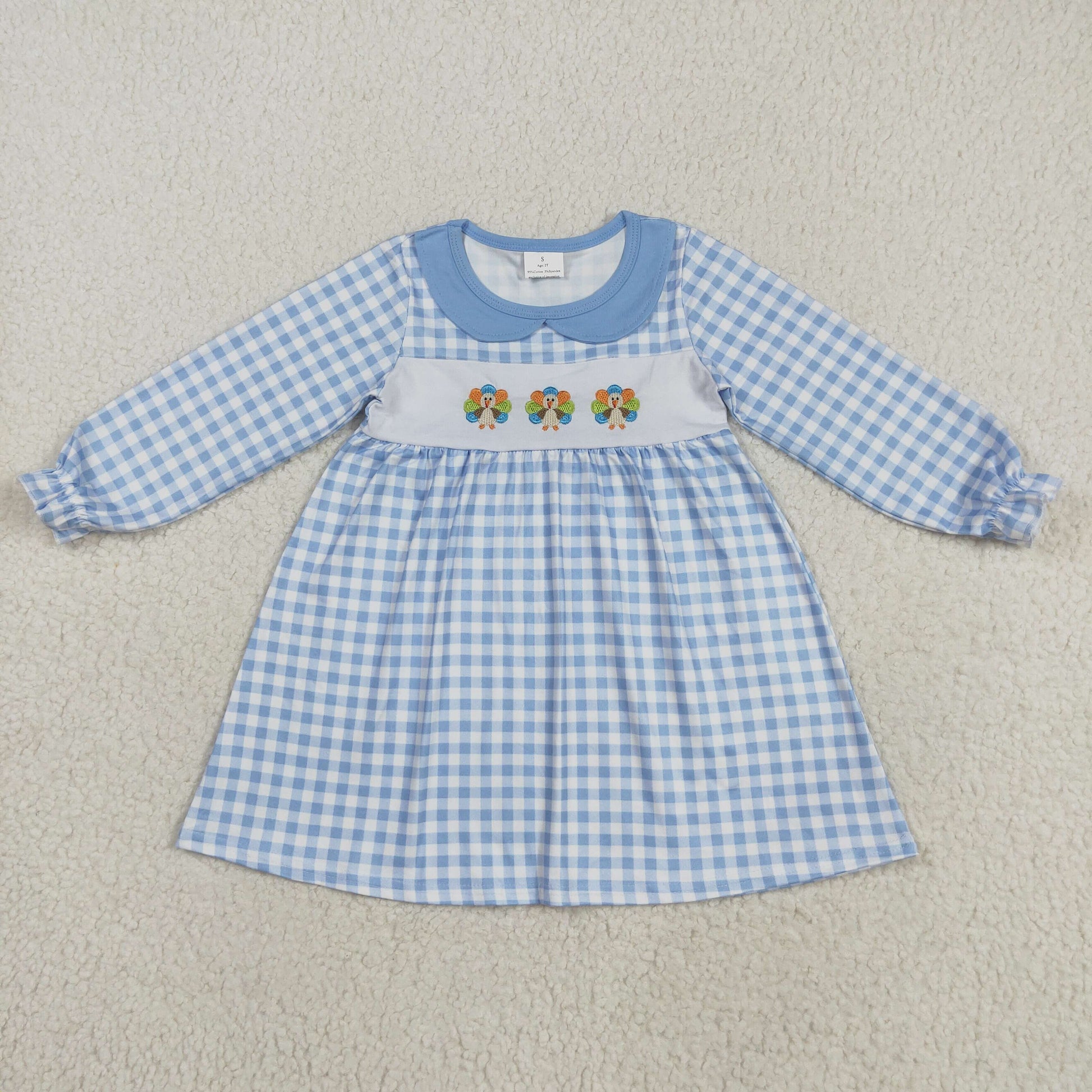 GLD1070 baby girls Thanksgiving Turkey blue checkered dress embroidery