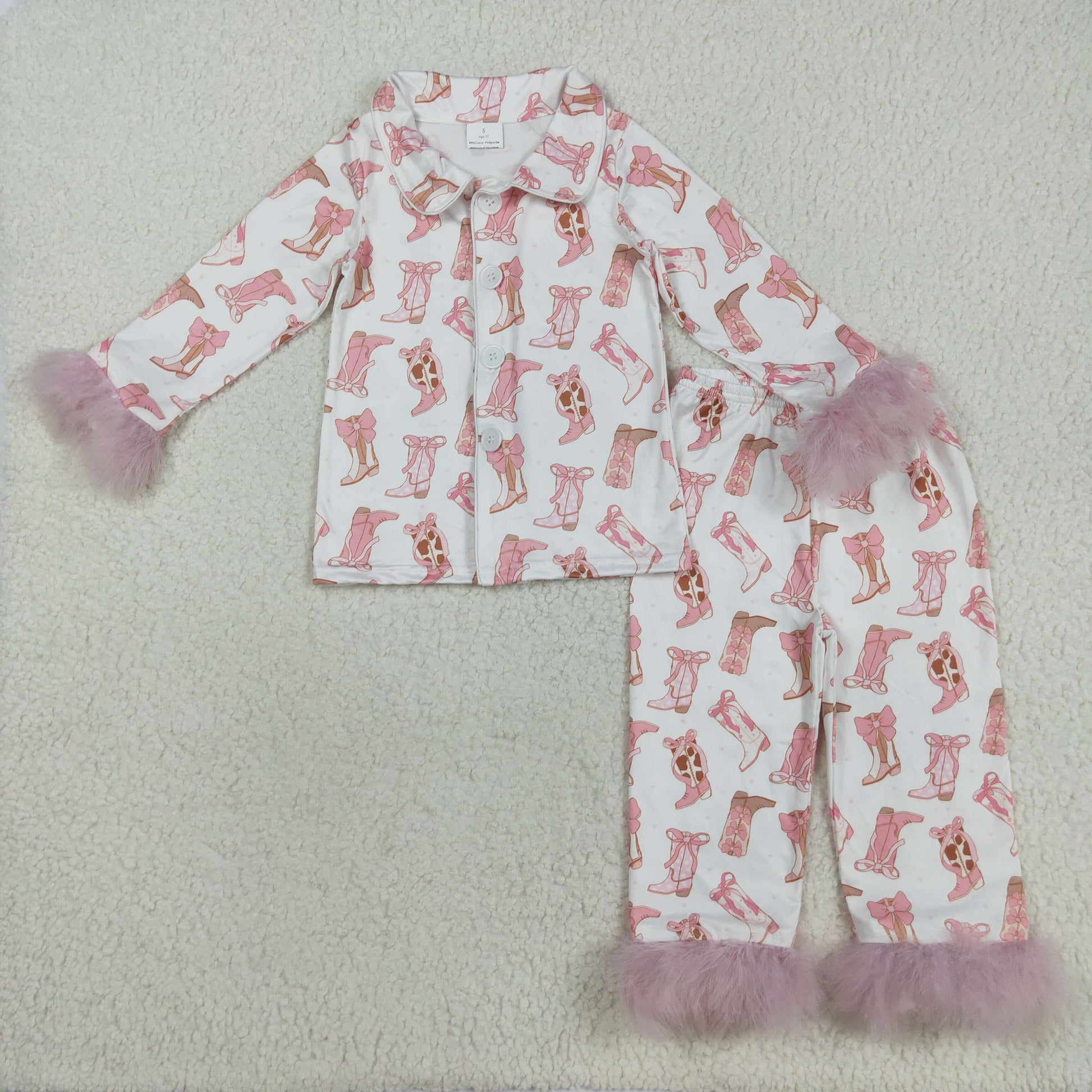 GLP2359 baby Girls boot bow button pink furry pajamas
