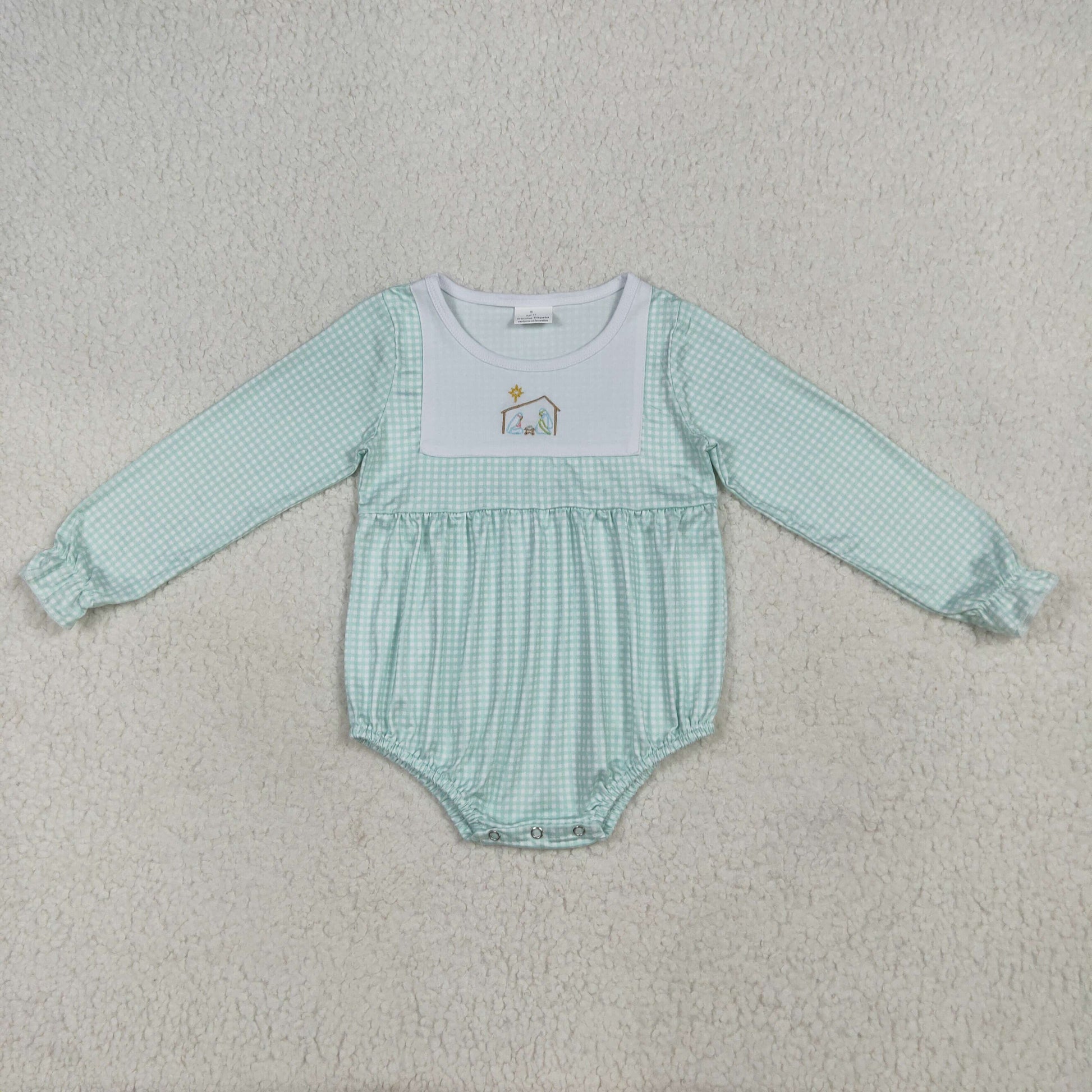 LR2265 baby girls Jesus green checkered long sleeve romper embroidery