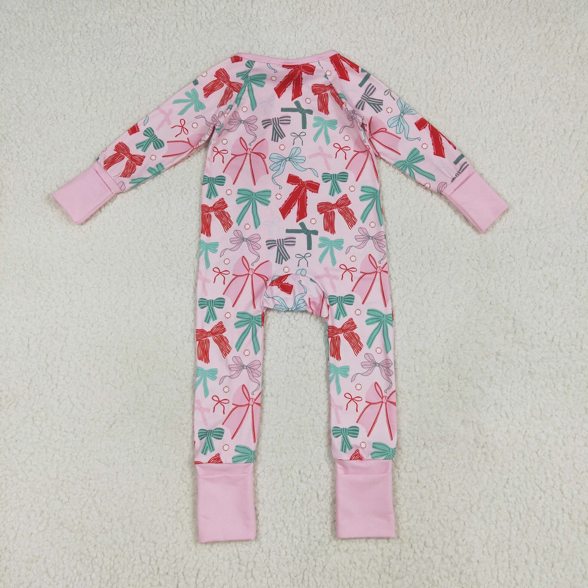 LR2266 baby girls red green bow long sleeve zipper pink romper