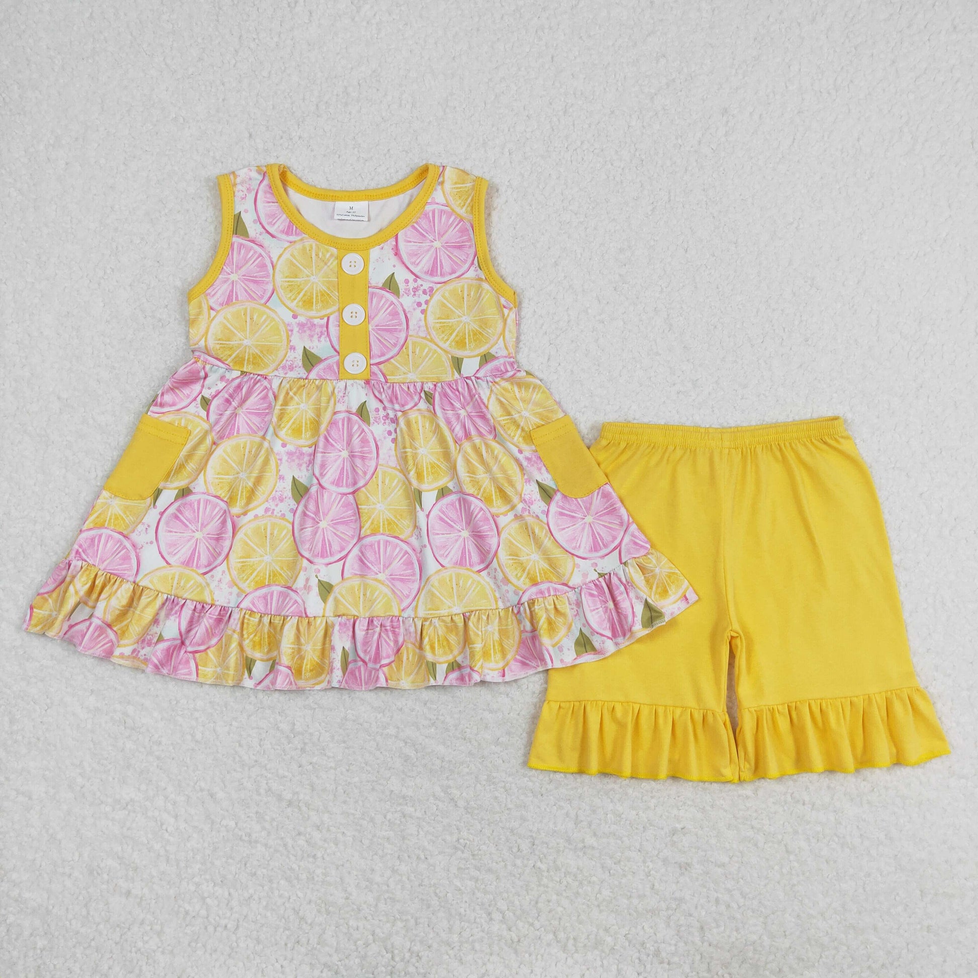 GSSO1079 Sleeveless lemon tunic ruffle shorts girls summer clothes